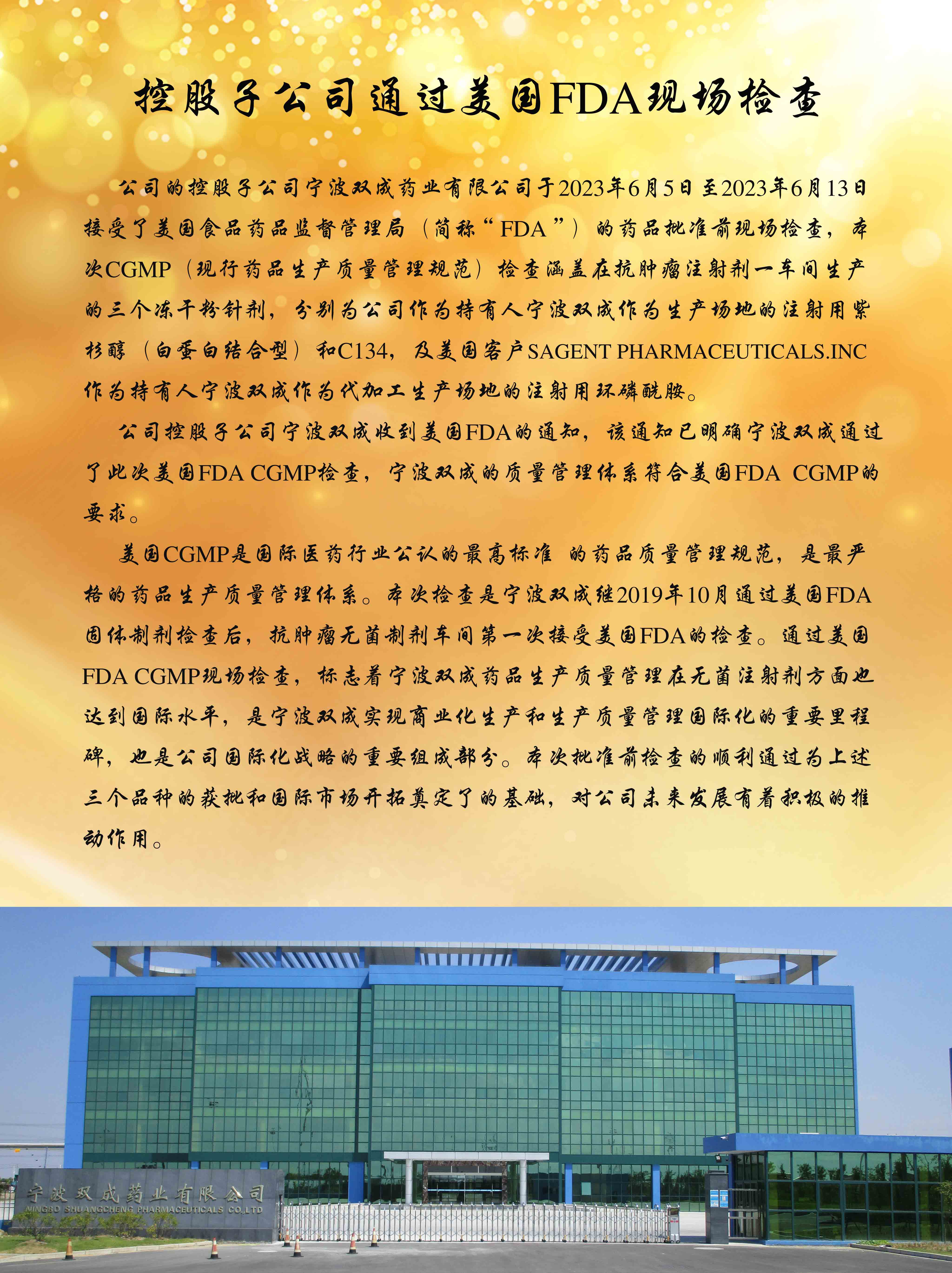 公司的控股子公司宁波双成药业有限公司于2023年6月5日至2023年6月13日接受了美国食品药品监督管理局(简称“FDA”)的药品批准前现场检查,本次CGMP(现行药品生产质量管理规范)检查涵盖在抗肿瘤注射剂一车间生产的三个冻干粉针剂,分别为公司作为持有人宁波双成作为生产场地的注射用紫杉醇(白蛋白结合型)和C134,及美国客户SAGENT PHARMACEUTICALS.INC(美国赛进制药有限公司)作为持有人宁波双成作为代加工生产场地的注射用环磷酰胺。