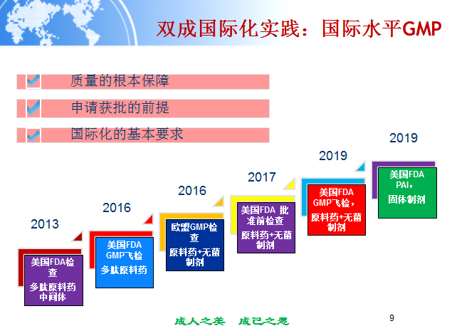 会上李建明博士着重为大家介绍了“双成国际化的实践”历程。近年来公司坚持国际化路线,建立了包括有多位具有多年国际经验的专业技术人员的研发团队和体制,同时也大大提高和完善了公司GMP的体系,其研发和GMP均能满足国际要求。2013-2019年期间公司已分别6次通过美国FDA和欧盟EMA的GMP检查,检查内容包括多肽原料药、无菌注射剂及固体制剂。原料药方面:公司的胸腺法新通过了意大利药监局(AIFA)技术审核;向美国FDA递交的两个DMF均顺利通过完整性审核,处于激活状态。制剂方面:公司已顺利获得意大利药监局(AIFA)注射用胸腺法新ANDA批文,可以出口销售;向美国FDA申报的注射用比伐芦定已获得审批。公司的研发项目形成了丰富的产品管线。