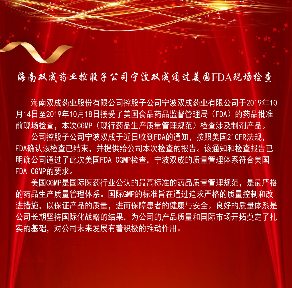 海南双成药业控股子公司宁波双成通过美国FDA现场检查
