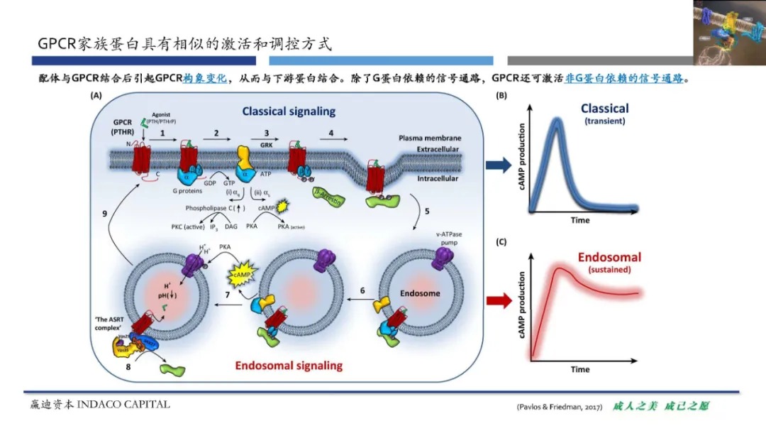 GPCR是7次跨膜蛋白,该类蛋白有着相似的调控方式。GPCR受到胞外配体的激活,从而发生构象改变,引发下游信号通路,通过第二信使等对生理过程进行调控。GPCR下游结合蛋白以G蛋白为主,但也存在非G蛋白依赖的信号通路,可以直接和G蛋白偶联受体激酶(G-protein-coupled receptor kinase , GRK)和抑制蛋白相结合。G蛋白也存在多种亚型,GPCR与不同蛋白结合将介导不同的下游信号通路。