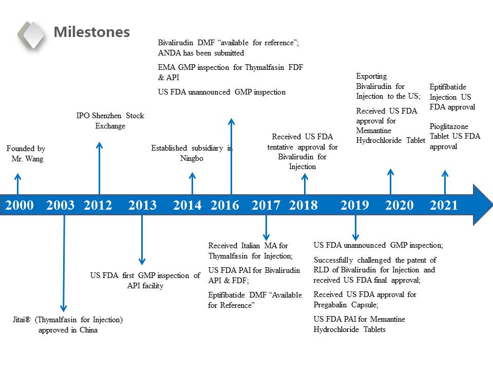 2018 Received USFDA tentative approval for Bivalirudin for Injection; Submitted quality consistency evaluation of Thymalfasin for Injection to NMPA;